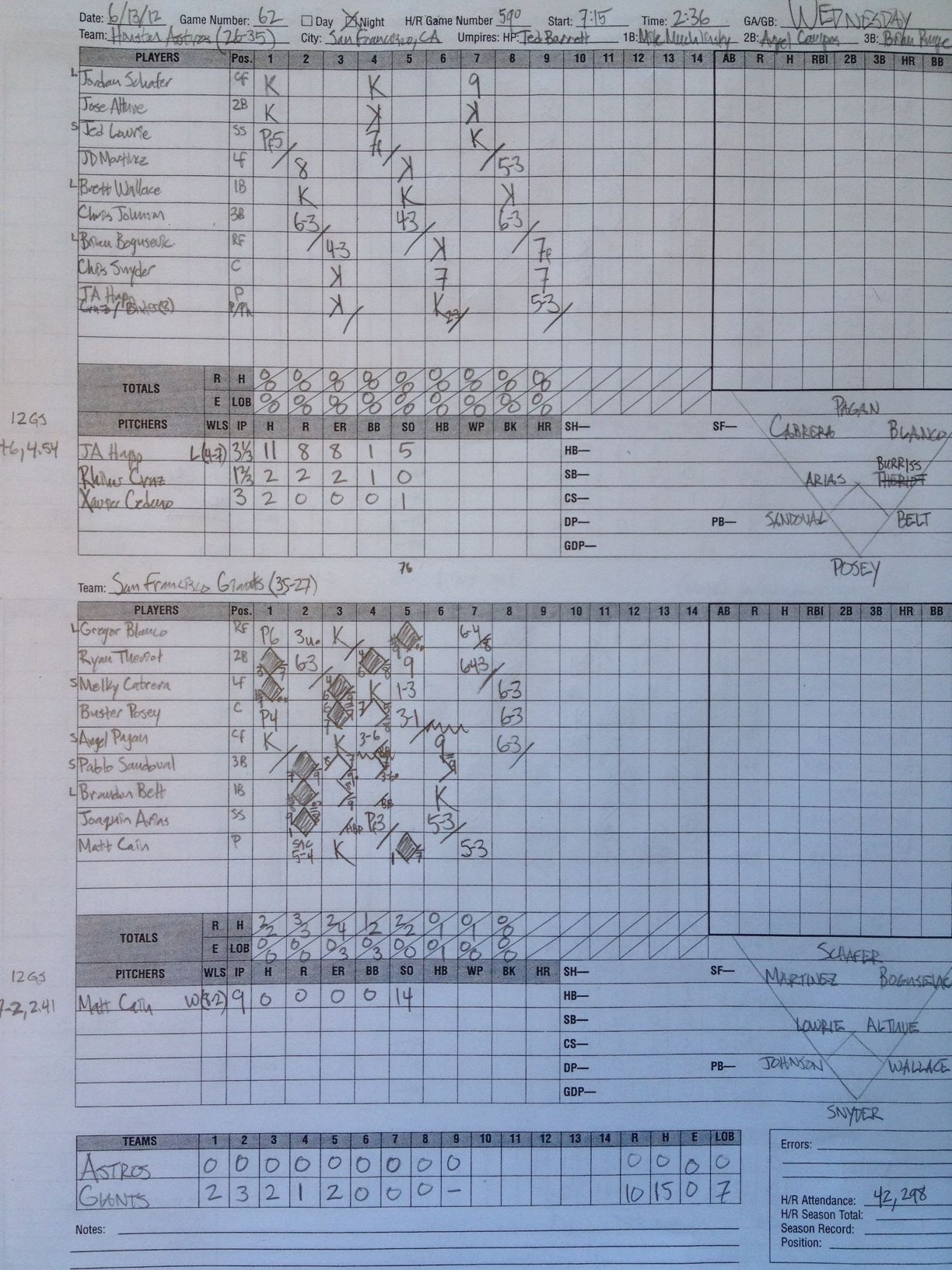 On Wednesday, the Astros draw Matt Cain.  His numbers pop off the stat sheet again this year.  However, he’s never had success against the Astros.  In seven starts against Houston, Cain is 1-3 with a 4.69 ERA.  It will be interesting to see how it plays out.